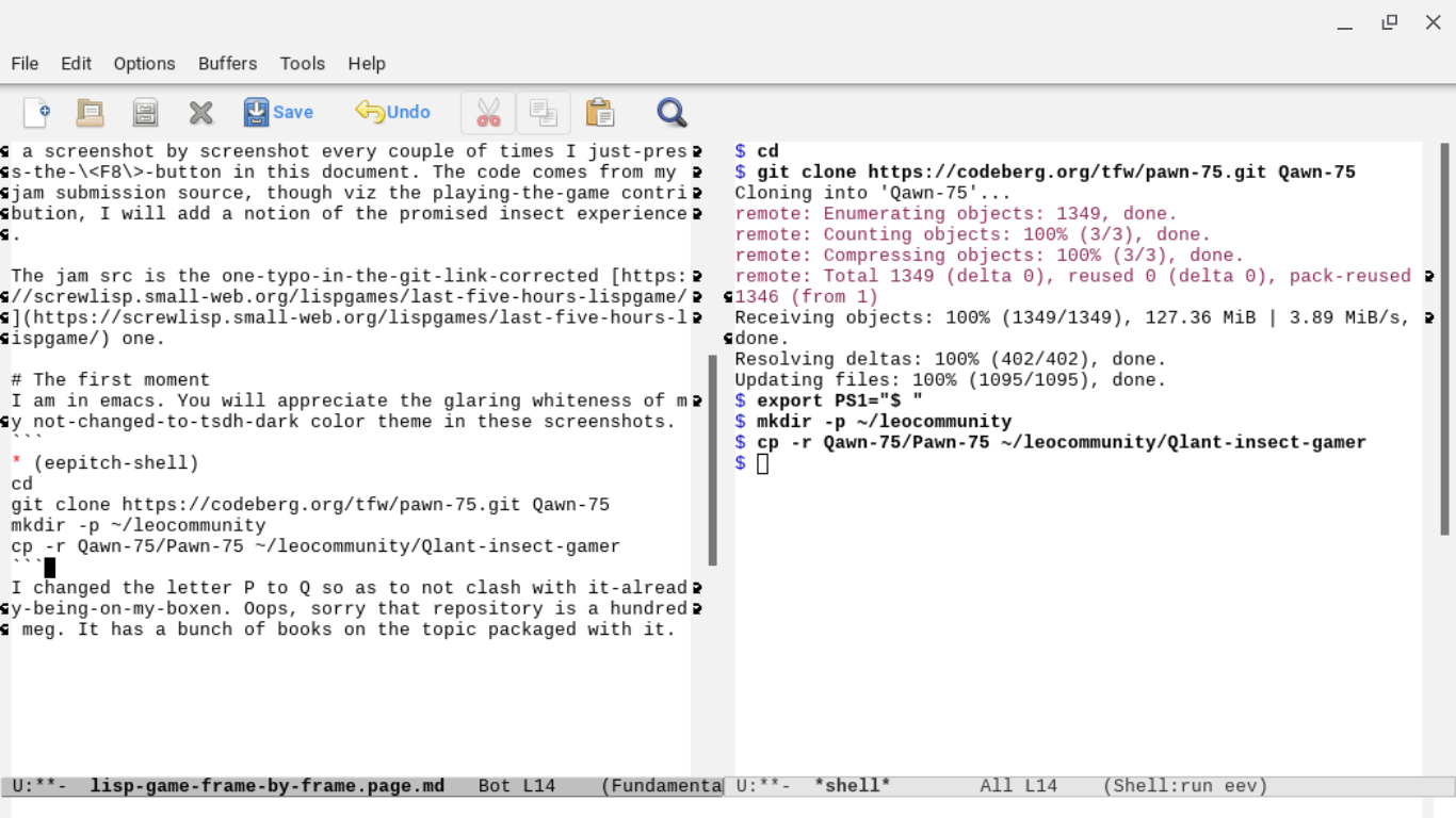 At this point, we have a software individual Qlant-insect-gamer. Note that now I am assuming you have the common lisp compiler, gnu clisp (and it /has/ to be gnu clisp) and slime. Actually, sly would probably work, but it is untested.