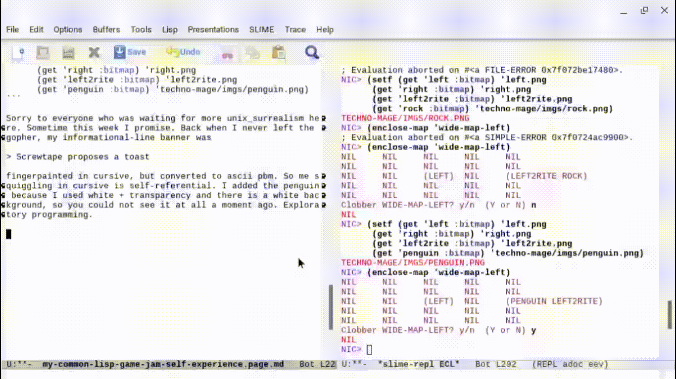 unix_surrealism_jam.lisp making levelsThis is my own experience of experiencing my own jam experience, not necessarily a tutorial. I had tried a few times to write otherwise and failed.